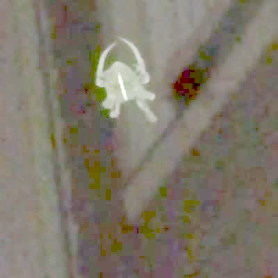 A man recording in night vision zooms in on a large spider bug that builds a web on a porch, then the spider bug jumps at the camera, and the man falls off of the porch. First person POV.