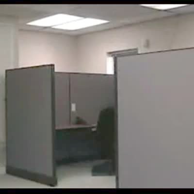 A woman steps on a cubicle wall and falls in to a cubicle full of balloons.