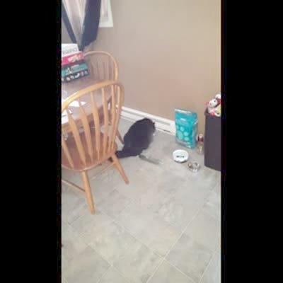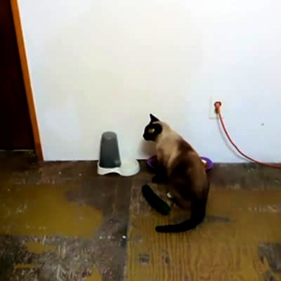 A man puts a cucumber behind a cat. The cat continues to eat. When the cat sees the cucumber it jumps knocking trash off a trash can.