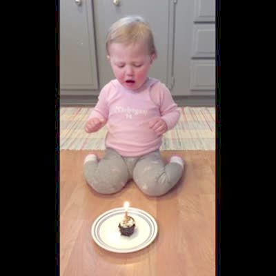 An adult man and woman sing Happy Birthday to a tot boy, who sings along, but before he can make a wish and blow the candle on his cupcake out, he sneezes and the candle goes out indoors.