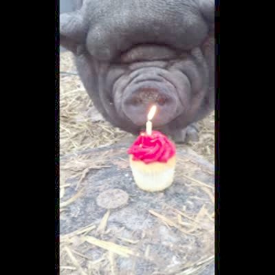 A pug dog blows out the birthday candle on its cupcake at the kitchen table.