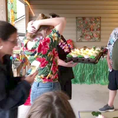 A teen girl stands in a backyard with her family, young boys and girls, and men and women, for her birthday party. Her mother walks out with a tray of cupcakes with lit candles, and her family starts to sing "Happy Birthday". The cupcakes all slide off the tray and land on the ground.
