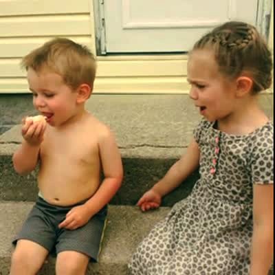 A young girl asks her tot brother what he's eating and he says "butt cake" while trying to say "cupcake."