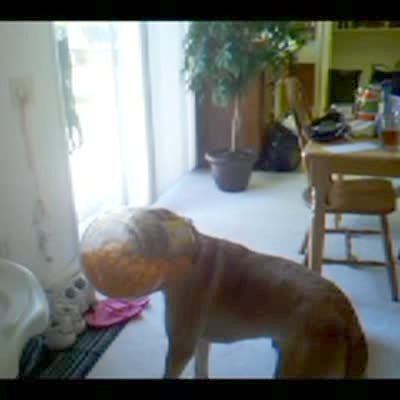 A dog walks around a living room with its head stuck in a half full plastic bucket of cheese balls. He eats the cheese balls while swinging his head around, trying to get the bucket off. Adults and another dog watch. Finally, a man pulls the bucket off his head. Sound cuts out after all of the action. Caucasian.