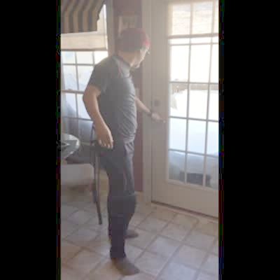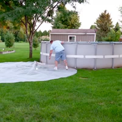 A man cuts open an above-ground pool, then the water floods out of it and knocks him down to the ground in a yard.