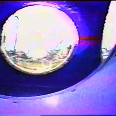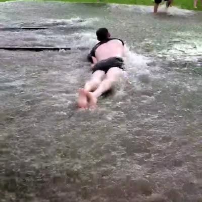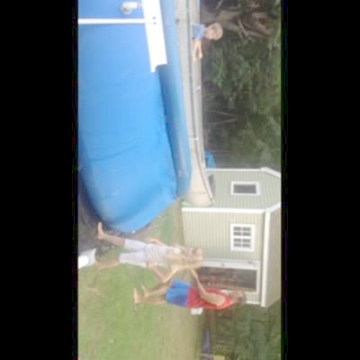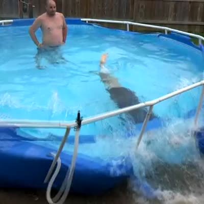 A man dives into an above ground swimming pool and cuts a hole in it from the inside. It rips apart and the man floats out along with all the water after he and a woman joke about being born. The backyard is flooded.