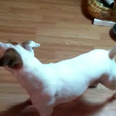 A man holds a cut-out picture of a cat up in a window while his small dog jumps and barks.