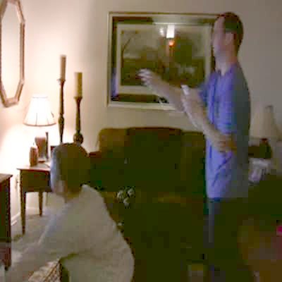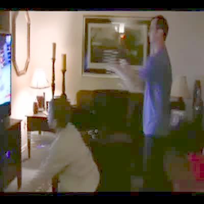 Dad hits boy in the head with Wii remote while they play boxing video game. No recovery. Clip cuts out.