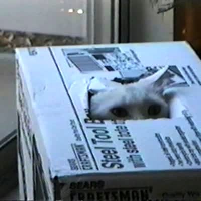 White cat hides in a box with a hole cut through the top. Cat pokes its head out & attacks a Golden Retriever dog.