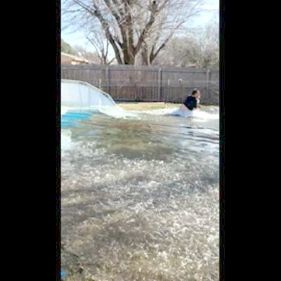 A man rides the water out of a pool when it's cut open. The water pushes him into a stationary garden box.