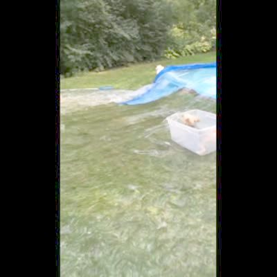 A man puts a dog into a plastic container in an inflatable pool. He then cuts the side of the pool and the dog gets carries with the water as it pours out.