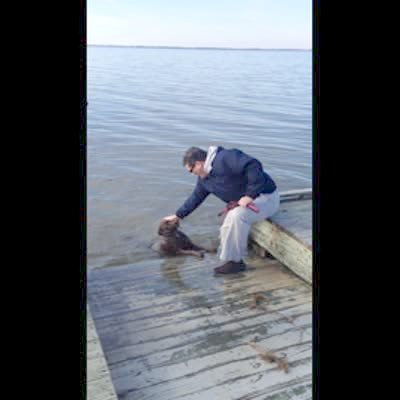 A man falls in to the ocean trying to help his black lab dog out of the water. Cuts away quickly after the fall, but comes back as the man gets out of the water.