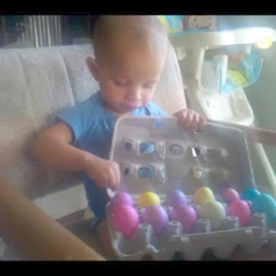 A young boy sits in a chair with a carton of Easter eggs. Then he spills all of the eggs out of the carton on the floor. Camera jerks down and cuts out as he's spilling. No tails.