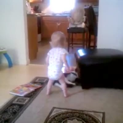 A tot girl walks around her cat indoors before the cat jumps up and pushes the girl over.