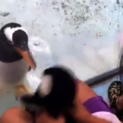 A beaver paws against a display glass as a girl on the other side follows his paws down and back up.