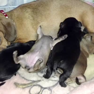 An English Bulldog dog sleeps and snores indoors and each time he breaths out, his jowls and cheeks flap.