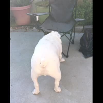 A dog shakes and jumps back with excitement each time his snack bag is popped open. Compilation of several videos.