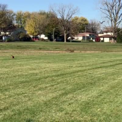 Two dogs run towards a flock of geese and the geese fly away. One of the dogs runs towards the camera, falls on its face, and flips over.