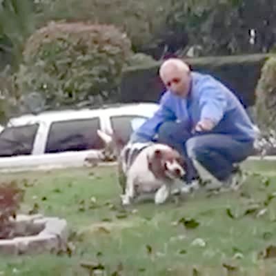 A Basset hound dog runs towards the camera in slow motion outdoors. Faces in slow motion