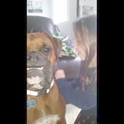 A boxer dog bares his teeth in a smile for the camera indoors while a woman and girl laugh at him.