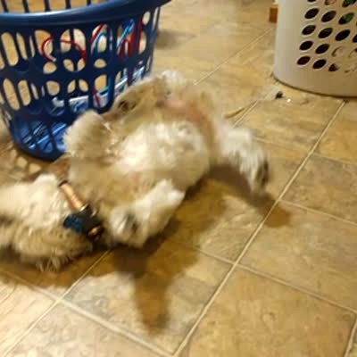 A dog scratches at its dog bed in a living room. The woman with the camera calls to the dog and it lifts its head up and its hair sticks out all over the place.