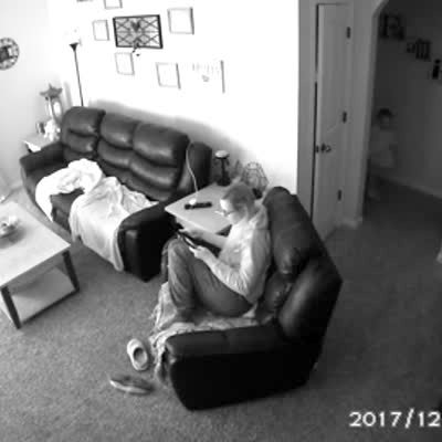 Security camera footage of a tot boy that holds a blanket over his face when he sneaks behind his mother's chair in a hallway.