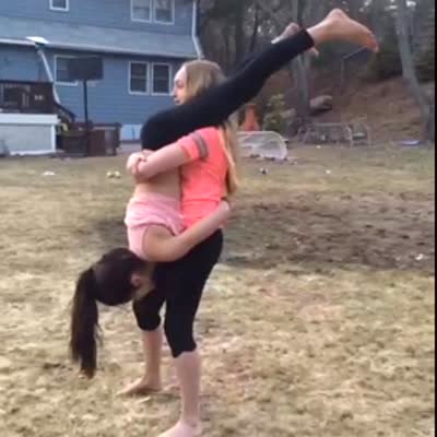 Two teen girls hold onto each other and do back walkovers with each other's help before one girl lets go and the other falls on her face outdoors.