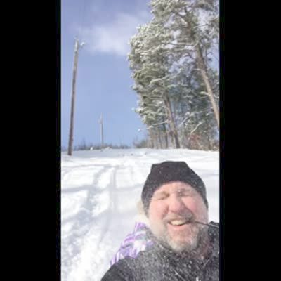A man and tot girl sled down a snow covered hill in winter. The tot girl says that she didn't get any snow on her face and the man says he didn't either, but his face is covered in snow.