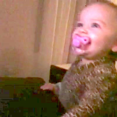 Baby girl watches TV and gets excited. Her pacifier falls out of her mouth. She sticks out her tongue, makes faces and yells. Cute.