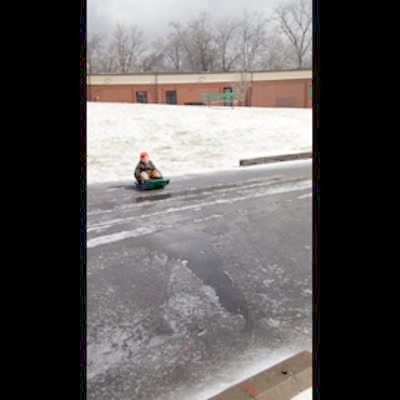A boy sleds down a hill and across a street before he slides under a park bench and hurts himself.