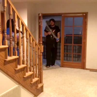 A young man walks through a doorway and his face hits a thin wall of saran wrap.