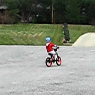 A tot boy rides a tricycle around the floor at home and asks for "horsepower" from his father, who kicks the back of the cycle and pushes him down the hallway. On the third lap the man pushes too hard and knocks the boy over.