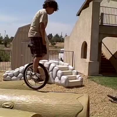 Boy with long hair rides a unicycle on top of a large log. He falls off the unicycle. No recovery, he doesn't get up. Park.