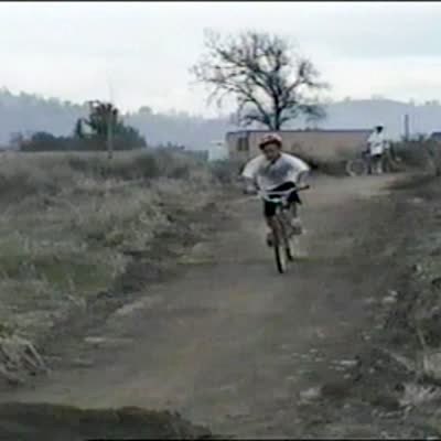 A teen boy rides a bike on a road and crashes into a real estate sign in a front lawn. Profanity. Short tails.