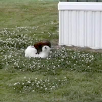A senior man holds a dachshund puppy in a backyard and says that she will go to the bathroom in a fenced enclosure that he made. He puts the dog into the enclosure and she immediately squeezes through the posts in the fence.