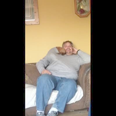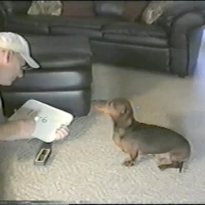 A man pets a Dachsund dog who whines in a backyard, then he asks the dog "is that good loving," and the dog whines a noise that sounds like "uh-huh."