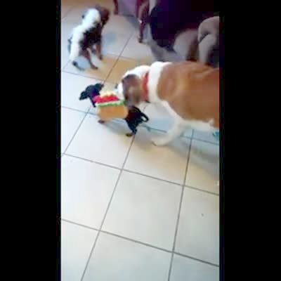 A dachshund sits in a dining room chair while people sing "Happy Birthday" to him, then they stop their song in the middle when the dog falls out of his chair.