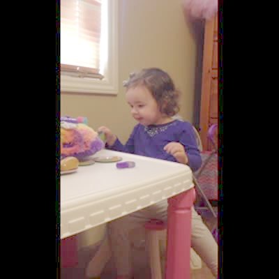 A tot girl gasps at a children's table in the living room when a dachshund dog eats a fruit snack off of her plate.