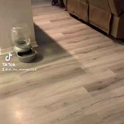 A woman gasps next to a dachshund dog who sleeps in a living room, and the dog sits up and stares at her. The woman says "sorry, false alarm." Gasp At Your Dog Challenge