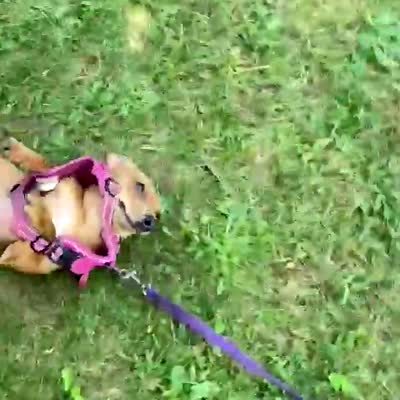 A Chihuahua dachshund dog shuffles its paws back in forth when it runs out to the backyard with a toy.