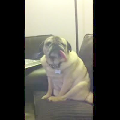 A pug dog has a long tongue that dangles out of its mouth.