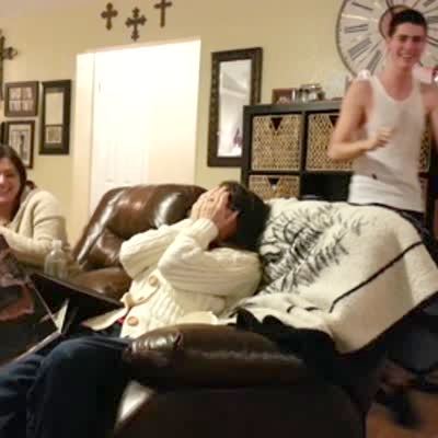 A man tries to attach a bungee cord to a television on the ceiling of a basement. The cord snaps and hits him, and gets caught in the back of his shirt making it difficult for him to get "unstuck." Security footage.