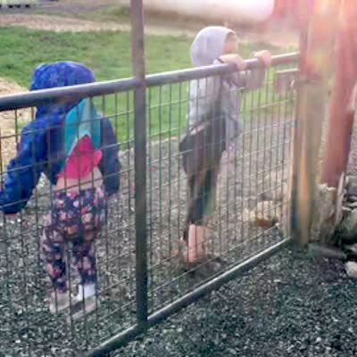 A young boy and his tot sister call for their dad because they are stuck on a fence gate and the tot girl is dangling outdoors.
