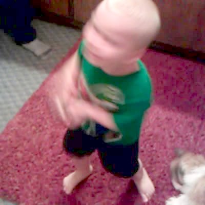 A young boy babbles and reaches into his pants and pulls out a large Nerf gun.