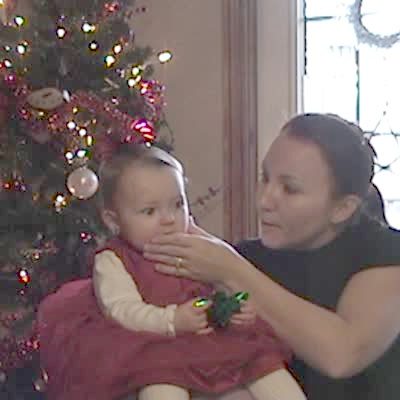 Woman sings "Deck the Halls" and a baby boy sings the "Fa La La La La" part. Christmas. Living room.