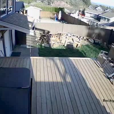 A man on his deck tries to put the lid back onto the deck box but the wind blows the lid back into his face. Security Footage.