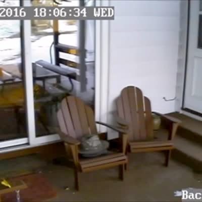 Three deer run up the driveway, then break a window in the garage while a man watches. Security footage.