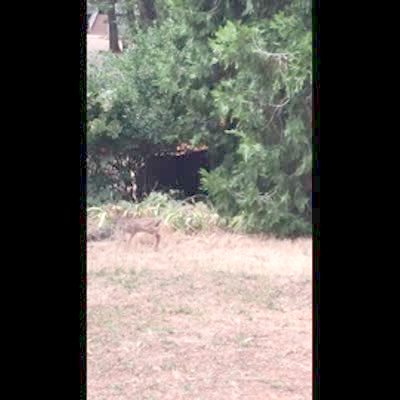 A cat sneaks up to a deer, then they both run away from each other in a yard.
