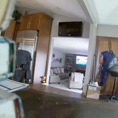 Loud crashes are heard off screen in a kitchen, then a young boy screams as a deer runs around in the house.