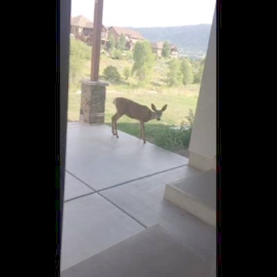 Security camera footage of a deer that runs in to a glass door. Shortly after the deer hits the door, a dog walks up to the door to look around.